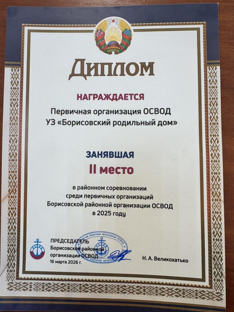 Во Дворце культуры им. М. Горького 16 марта 2026 года прошла отчетно-выборная конференция Борисовской районной организации ОСВОД. По итогом которой Первичная организация «Борисовского родильного дома» заняла 2 место в районном соревновании среди первичных организаций Борисовской районной организации ОСВОД в 2025 году